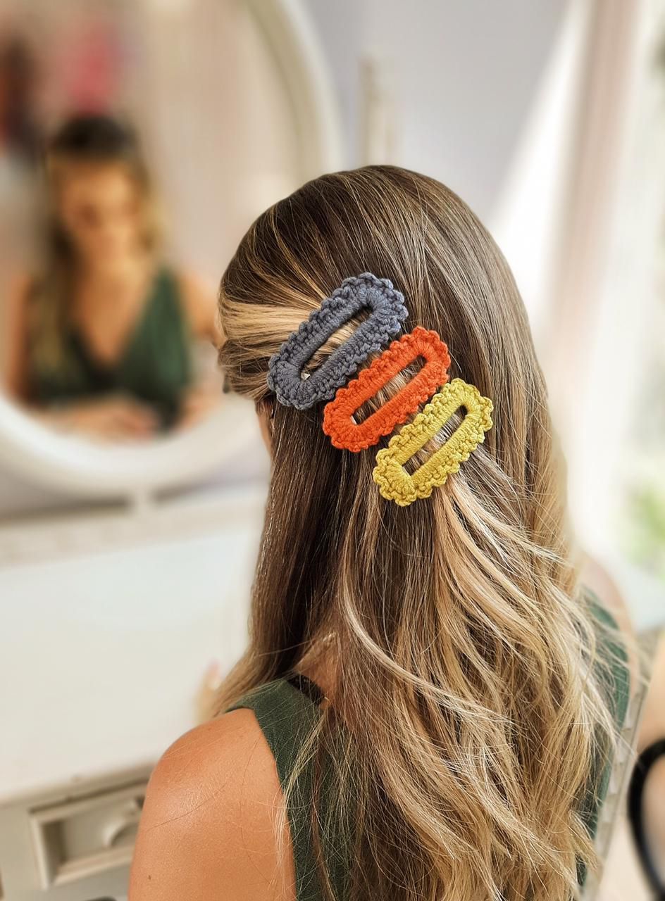 Arrematar penteados, dar um truque quando o cabelo não está muito legal ou complementar a produção é tarefa para um bom acessório de cabelo! E esse tic tac é perfeito para isso! Ele é todo feito à mão por conta desse trabalho no fio de lã, o famoso crochê.